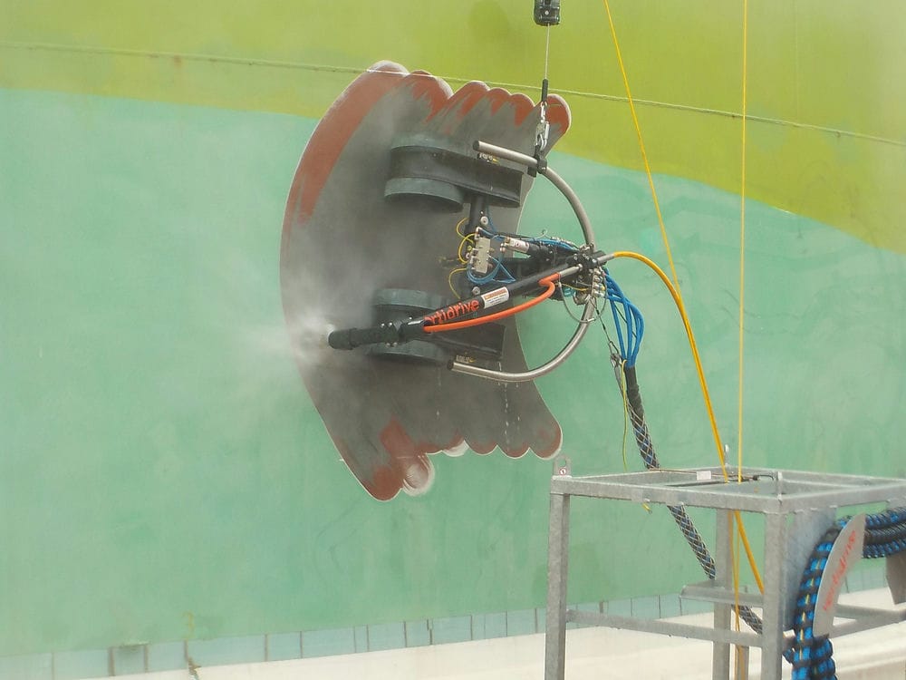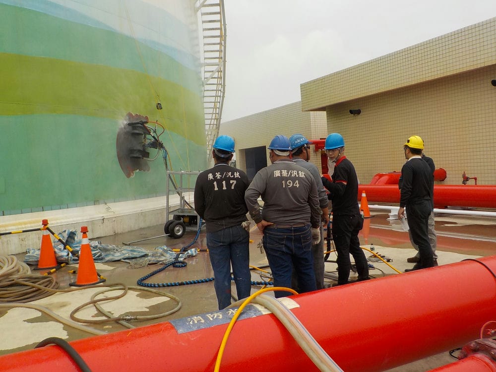 對於作業場所高度較高、需水刀除鏽的平面(例:儲槽、燃燒塔),可節省施工架搭設之成本,使用可吸附於施工面的水刀機器人進行高壓水刀除鏽作業。